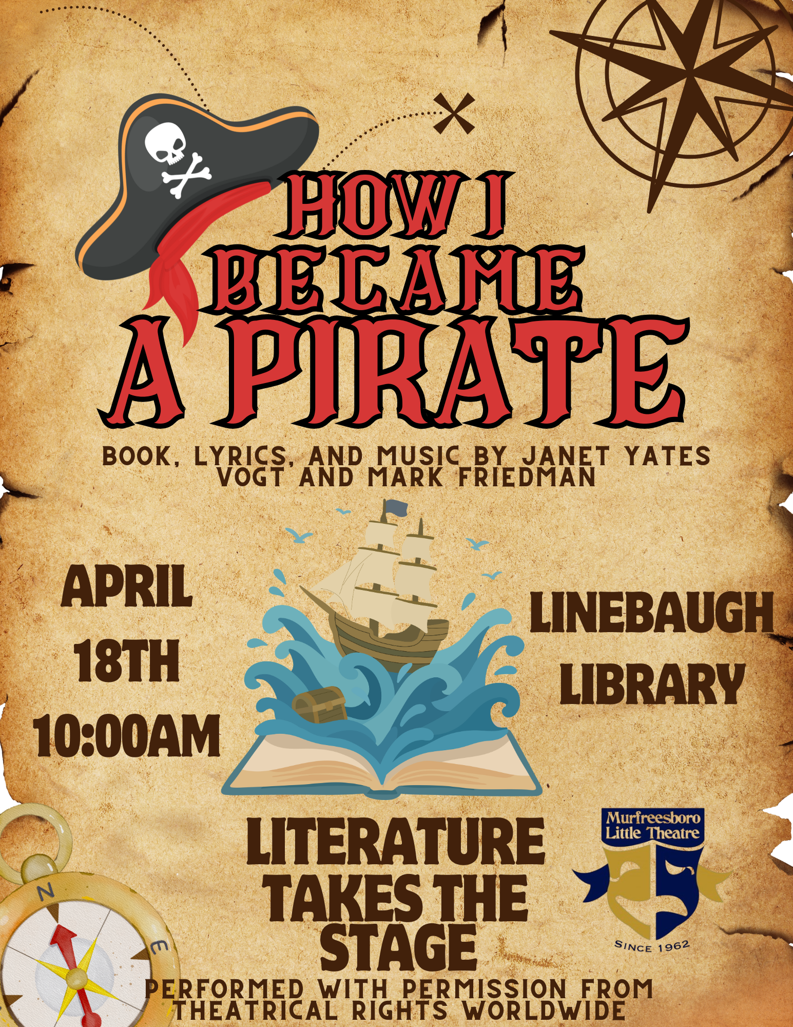“How I Became a Pirate” is based on the book written by Melinda Long with illustrations by David Shannon and is presented by the Murfreesboro Little Theatre. Sail off on a fantastic musical excursion when a band of comical pirates lands at North Beach looking for an expert digger to join their crew. Braid Beard and his mates enlist young Jeremy Jacob as they look for the perfect spot to bury their treasure. Jeremy finds that adventuring can be lots of fun, but also learns that love and home are treasures you can’t find on any map! The whole family will love this delightful and swashbuckling musical adventure.
