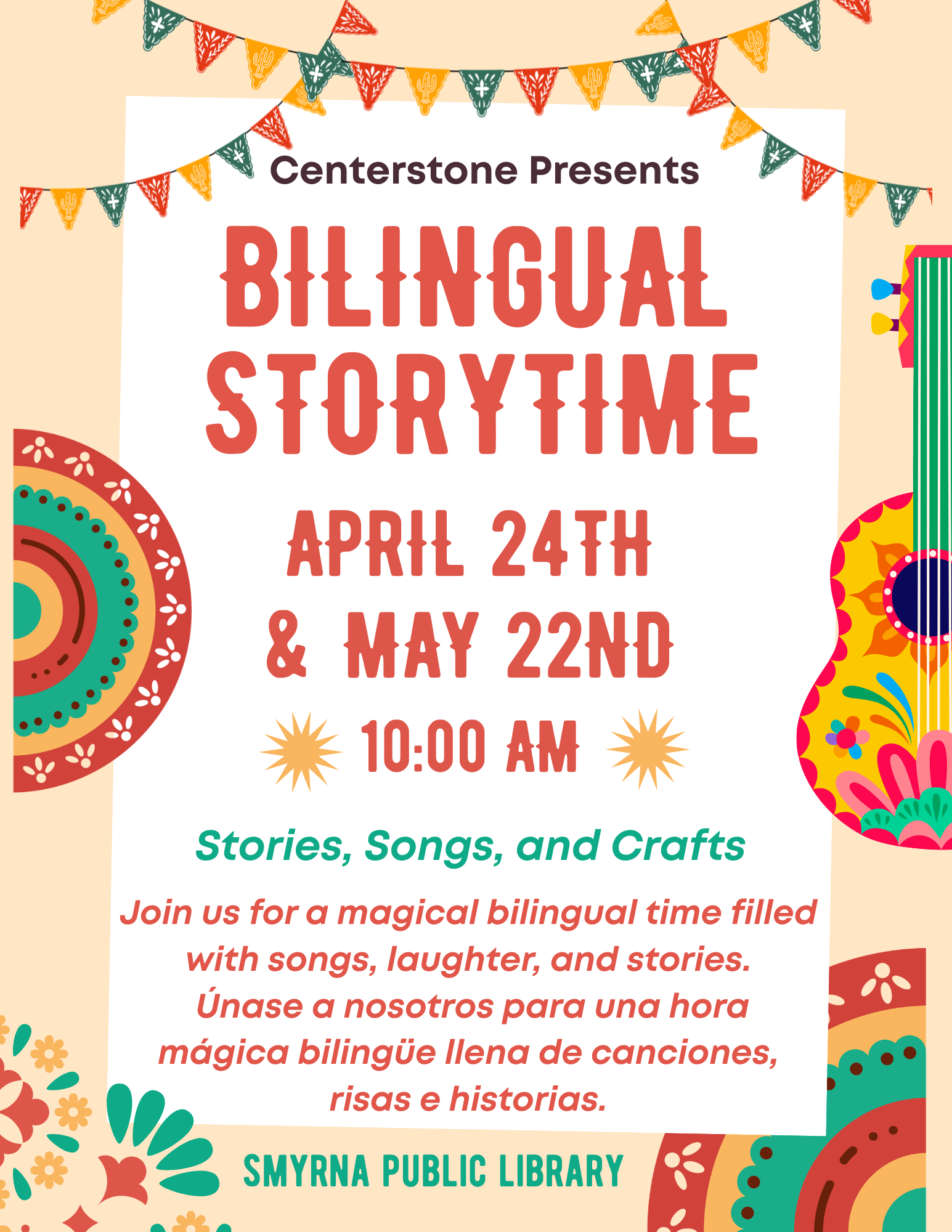 Join us @ Smyrna Public Library 10 a.m. for a magical bilingual time filled with songs, laughter, and stories. Únase a nosotros para una hora mágica bilingüe llena de canciones, risas e historias. This program is designed for children and their caregivers to engage in a fun and interactive environment. Este programa está diseñado para que los niños y sus cuidadores participen en un entorno divertido e interactivo. For all ages Para todas las edades