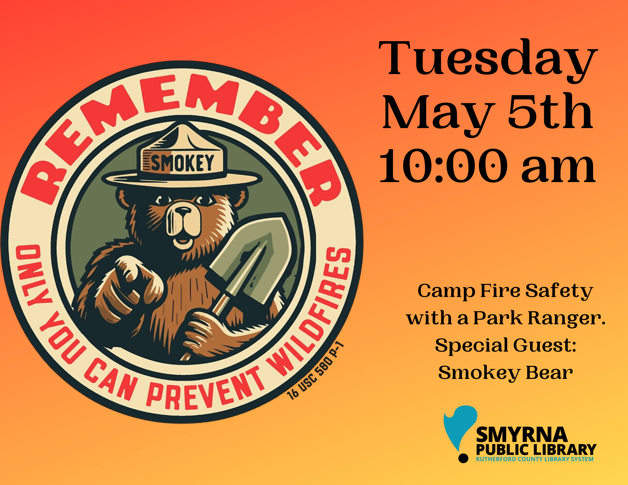 Joins us @ Smyrna Public Library 10am for a story and camp fire safety presentation! Meet and take photos with Smokey Bear and Park Rangers!