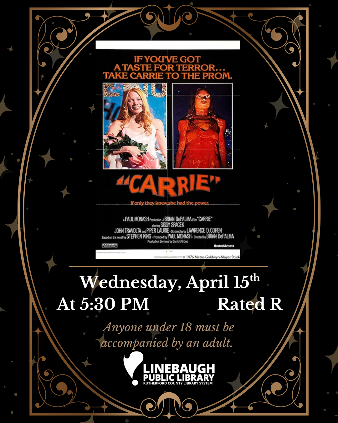 Join us for a showing of Carrie at Linebaugh. Movie is Rated R. Anyone under 18 must be accompanied by an adult.