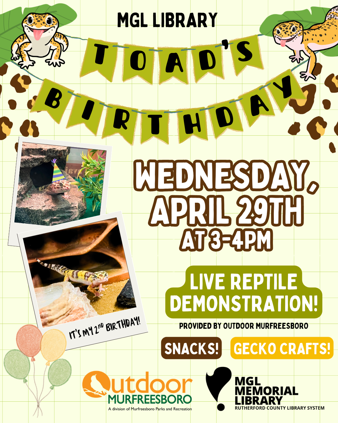 Toad’s Birthday Bash at MGL Library will be Wednesday, April 29th from 3-4pm. Birthday festivities include a live reptile demonstration (provided by Outdoor Murfreesboro), birthday snacks and treats, and some take-home gecko crafts for everyone to enjoy.